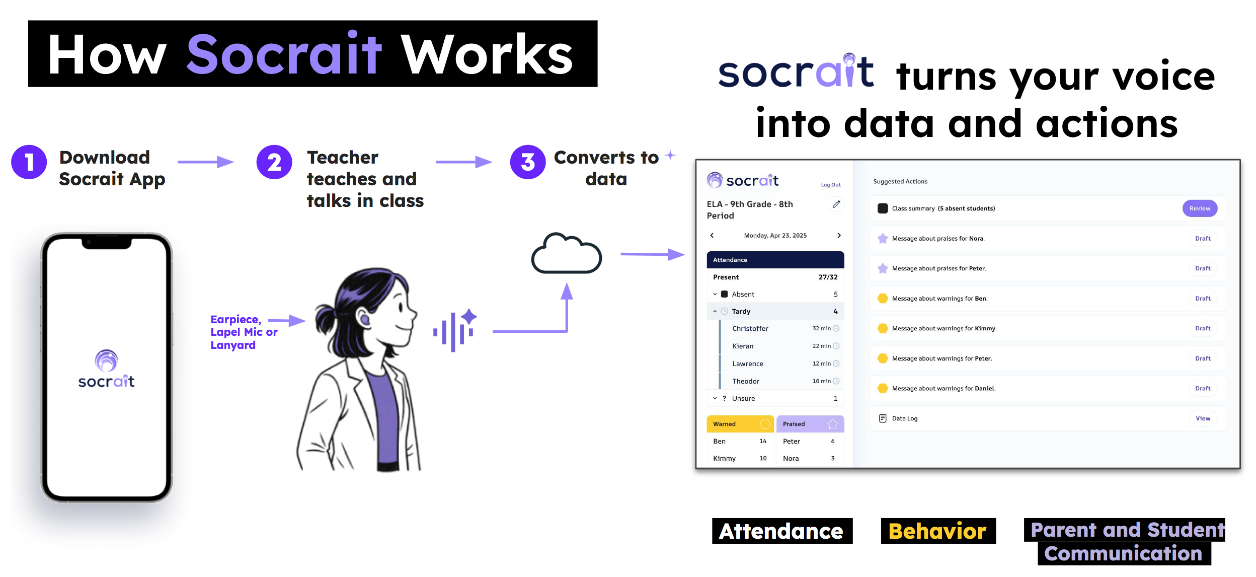 Socrait is a voice-enabled AI-powered class assistant, designed to save teachers time and reduce burnout. Socrait takes what a teacher says in the classroom, as they normally teach, and turns it into data and actions. This data includes behavior data and actions around warnings and praises, attendance data, class summaries, and reminders.